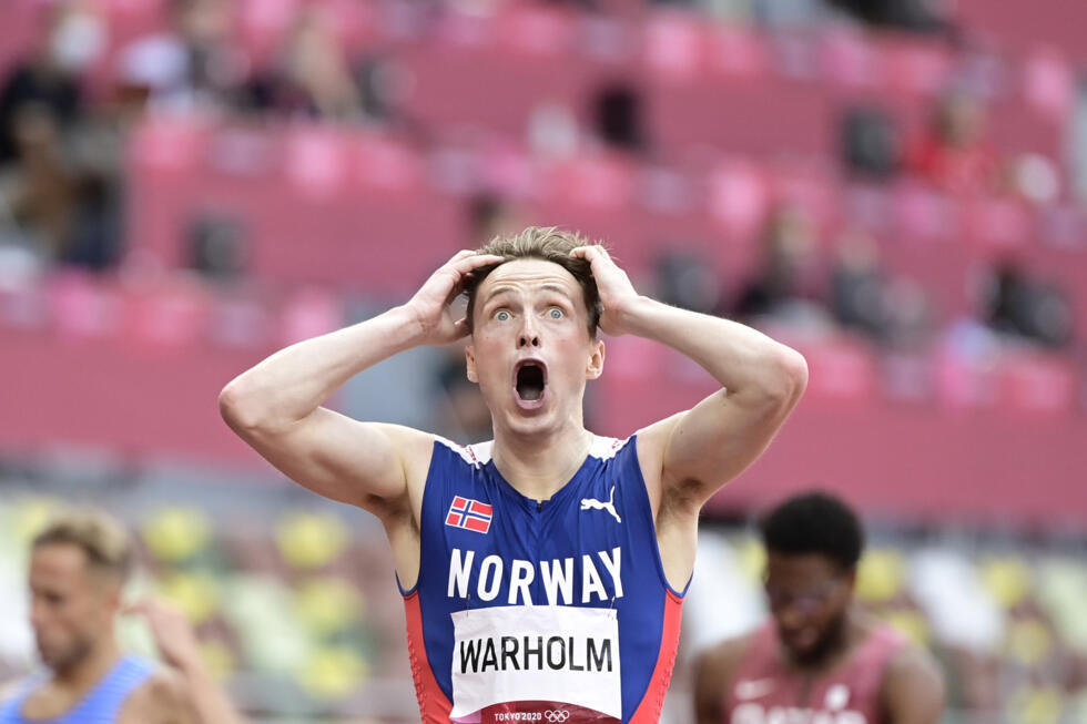 Norway's Karsten Warholm reacts after winning and breaking the world record in the men's 400m hurdles final during the Tokyo 2021 Olympic Games.